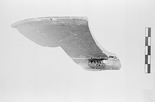 | Description: | Only a small segment remains. High base ring, coarsely moulded; deep body; the rim thickened by being rolled inward. Buff clay; flaky black glaze. Traces of stacking on the floor. | |