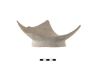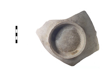 | Description: | Single fragment preserving base and lower wall. Raised ring base. Flaring wall. Pink-buff micaceous cooking fabric with white slip on exterior. On underside graffito M marked with chalk-like substance. | |
