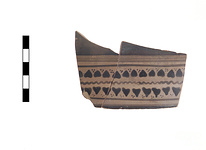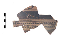 | Description: | Two fragments, a) seven joining wall fragments and b) two wall fragments, preserve portion of sloping shoulder curving into rounded belly. a) Preserves a small section of shoulder panel with back leg of a feline and hoof of a quadraped. Below: reserved line, wide black-glazed band. At handle zone elaborate horizontal ivy band: squiggly line between reflected heart-shaped leaves. Between each leaf, three dots. Thin lines above and below. Below ivy band black glaze. Trace of handle at right. b) Preserves more of ivy band. Added red: line below shoulder panel, line below ivy band. Added white: leg of quadraped. Pinkish-orange clay, dull black glaze fired red in places. | |