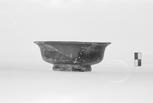 | Description: | Broken and lacking small fragments from the side wall. Restored in plaster. Heavy flaring base ring, gently concave floor with high upper wall and out-curved lip. Buff clay. Flaky glaze, mottled black and brown. | |
