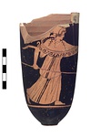 | Description: | Two joining fragments preserve most of body; broken off at base and shoulder. Surface scratched. Rounded at base, widening toward shoulder. Reserved band below shoulder with maeander on white ground. Athena Promachos striding right, on reserved groundline, added white on helmet. Fine orange fabric. Good shiny black glaze, cloudy on one side. | |