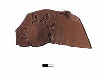 | Description: | Five joining sherds preserve greater part of base and floor. Upper surface crazed in places. Floor scratched from use. Shallow floor on low ledge-like foot. A circular band of stamped "lotus" motifs on floor (Hayes, LRP, motif 12), pointing inward, 7 out of original 8 stamps preserved, and flanked within and outside by shallow grooves. Orange-red clay and slip. Phocean red slip ware. Original shape: Hayes LRP late form 2 or early form 3. | |