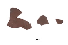 | Description: | Foot, most of lower body and one fourth of neck and rim missing. Three non-joining body sherds preserved. Capacious jug with high, rounded shoulder. Cylindrical neck decorated with widely spaced spiral grooves, with eight to nine grooves from base of neck to just below rim. Projecting rim, horizontal and flat on top. Thick handle with two grooves in outer surface runs from shoulder to rim. Fairly hard, very micaceous, friable fabric with large flecks of golden mica, 2.5 YR 5/4 in break. Hard red gloss on exterior, ca. 2.5 YR 6/8. Import, perhaps from Asia Minor coast. Hellenistic. | |