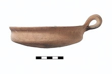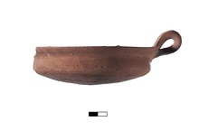 | Description: | Missing half of body and slightly over half of rim. Rounded body with marks of wheel-trimming. Slightly inclined upper wall. Projecting rim with flange for lid on interior. Loop handle attached to rim. Hard, gritty cooking ware with a little fine mica and some large pieces of lime. Red clay (2,5 YR 5/8). Blackened irregularly on underside and on lower surface of handle. Hellenistic. | |