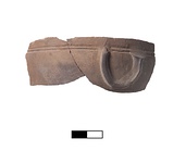 | Description: | Two joining body sherds. Near-vertical side of a semi-closed form, with a pair of grooves above. On main wall-zone, a large applied semi-circular hanging loop, perhaps imitating a swinging handle (W. ca. 0.030m.), unevenly finished at top ends. Traces of a floor-angle below. Thin deep reddish-brown ware, fired dull brown-gray on outside; very fine mica. NW Asia minor series. Unique? (JWH) | |
