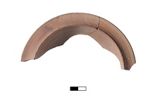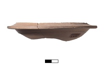 | Description: | Two-fifths of rim and upper wall in two joining sherds. Shallow rounded bowl, with flat horizontal rim rising to a point at inner edge. Scar around exterior from stacking in kiln. Undecorated. Abnormal firing. Clay brown, with partial coating of very thin absorbed slip. Hayes L.R.P. form 6/7 variant (subsidiary series?). Associated pottery of 3rd. quarter 5th. Century. Phocean red slip ware. | |
