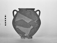 | Description: | Much of side wall missing; restored in plaster. Low base ring, barrel-shaped body; slightly flaring lip; vertical, ridged strap handles. Buff clay covered with a pale yellow slip, much flaked. Unglazed. | |