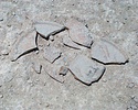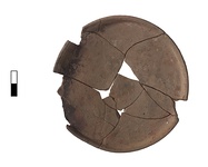 Description:   Pyre saucer. Mended from thirteen fragments. Missing about one-quarter of rim and small gaps in body. Flat, wide base with string marks. Wall is slightly concave near base, convex near rim. Rim curves inward.