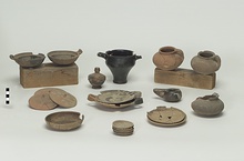 | Description: | Pyre saucer. Mended from three fragments. Missing chip in rim. Flaking slip. Uneven underside with string marks. Rounded wall, concave near base. Buff-orange clay; orange slip, fired greenish-yellow in the interior. Black stains, presumably from burning. | |