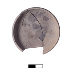| Description: | Small pyre saucer. Mended from three fragments; ca. one eighth of wall and rim missing. Slightly raised base with string marks. Incurved rim. Unglazed. Burnt, especially on inside. | |