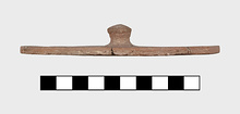 | Description: | Fragments are missing from the rim. Restored in plaster. A flat disk with a small knob rising from its midpoint. Coarse red clay, unglazed. | |