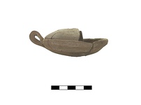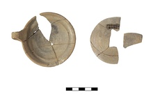 | Description: | Body a) mended from seven fragments; small section of rim and wall missing. Lid b) mended from five fragments, with a non-joining fragment c). About half missing, including knob. Burnt rounded bottom; rim offset on inside for lid. Small loop handle. Plain domed lid. Cooking fabric. | |