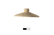 | Description: | Lid (a) in three joining fragments, small piece of rim missing. Of body, three fragments of rim (b-d) and one of lower wall and base (e) are preserved. Flat bottom with string marks. Delicate rim with flange on interior. Low conical lid with solid knob. Household fabric, with burning on inside of body. | |