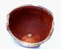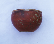 | Description: | Approximately three-quarters complete. One non-joining fragment. Complete profile. Short everted rim, globular body. Flat base. Black glaze all over, misfired red-orange with streaks of black in parts. Reserved: band just below rim (one on interior, one on exterior), small circle in tondo, and base. Orange clay. | |