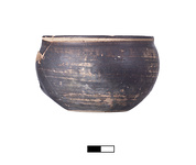 Rounded body, flat base, slightly flaring rim. Streaky black paint inside and out, fired mat. Reserved: band just below rim (one on interior, one on exterior), small circle in tondo, and base.