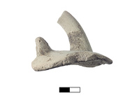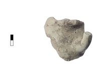 | Description: | Single fragment preserving small portion of shoulder, neck and lower handle of closed vessel. Handmade. Shoulder curving in; vertical neck; vertical handle, circular in section, attached to upper shoulder. Light-colored clay characteristic of Aegina, fired close to very pale brown 10 YR 8/4-7/4. AS 1087 | |