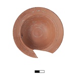 | Description: | Complete except for small gap in wall. Mended from six fragments. Small bowl with steep wall, low angular foot and broad rim. Top of rim bears sharp-cut moldings, lip slightly hooked, bearing four equidistant groups of small triangular notches along its upper edge. Two grooves on inner floor. Orange fine grained clay with slightly more reddish slip on interior and splashed on exterior. Ca. 375-400/420 A.D. African Red Slip. | |