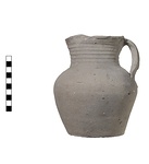 | Description: | About one-third of rim missing, otherwise complete. Two small neck fragments mended and plaster fill. Wide neck with everted lip slightly concave on top, trefoil mouth. Plum body. Flat base untrimmed. Wheel ridges on entire neck, lopsided ridged handle. Gray clay with numerous lime inclusions. Early 5th c. A.D. | |