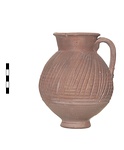 | Description: | Body intact, but chipped and cracked rim. Rounded out-turned lip. Vertical gouging on upper body, slanting towards one side, mid belly with few wheel ridges. Sliced handle with three grooves. Light orange clay. Partial dull slip fired orange to brown, drip on interior. Early 5th c. A.D. | |