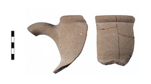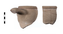 | Description: | Two joining pieces (one mended from four fragments) not mended preserve three-eights of rim plus one upper handle segment making up complete profile of neck to turn out at top of shoulder. Narrow simple out rounded rim with very narrow undercut join with neck wall. Bulging neck pulled in more at lower part than around rim. Oval section handle placed at top of neck. Reddish-brown paint over top and outer face of rim onto upper neck, thin stripe poorly preserved on outer face of handle. Gritty yellow-brown surfaces, micaceous. | |