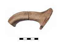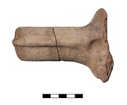 | Description: | Two joining fragments making up most of one handle with attachment to shoulder. Thick, oval section handle with central rib along outer face. Thumbprint at base. Fairly smooth, dark greenish brown surface. Much mica; very dark brown core. | |