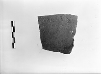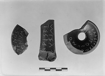 | Description: | Black glaze large cylindrical handle. Small fragment (about 0.007m. in diameter) of glazed inner surface of pot preserved. Along upper (? better glazed) surface, scratched: <graphic> Attic clay. Glaze fairly solid black on inscribed surface, painted thin oposite side; solid red on preserved inner surface. | |