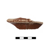 Body fragment of a cup with upright flanged rim, jutting out from the lower part of the wall. Rouletting on offset band below flange. Remains of moldings on inner face of rim.