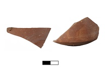 | Description: | Base and lower wall fragment (a) and a wall sherd (b). Carinated bowl. No decoration. Clay brownish, slip washy deep red on outside, purplish on inside. Clean breaks. Probably Knidian ware. Context material mainly first half 1st century (a few later sherds). | |