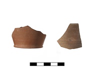 | Description: | Beaker base (a) with lower wall. A piece of loose rim (b). Tiny foot at edge of base, marked off by a groove above, and a small molding on underside. Faint chattering marks on wall. Rim, with rouletting below the shoulder, from the same context, may belong to this vessel. Reddish-brown clay. Ca. 20-10 B.C. | |