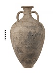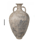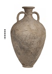 Flat-topped projecting rim on short tubular neck. High strap handles attached to center of shoulder, ovoid body, ring foot. Black dipinto on shoulder.