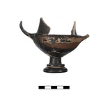 | Description: | Mended from numerous fragments. Most of handles and upper body missing. One small loose fragment. Glaze worn. Molded foot, conical underside, high stem. Pointed lower body incurved at level of lower attachment of handles. Preserved parts of upper body are vertical. Painted solid but scraped groove at foot and resting surface. Resting surface seems to have been scraped with sharp tool after glazing. Glaze fired red to black, matte black glaze. | |