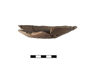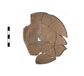 | Description: | Mended from fourteen fragments, about half of rim missing. No handles preserved but trace of one handle attachment. Rounded base, straight wall. Plain squarish rim. Micaceous light orange clay with traces of burning on one side. Unglazed. Eleven (11) small non-joining fragments in a bag. | |