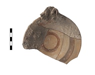 | Description: | Four joining sherds (two were added later from the lot). About two-thirds of the plate preserved with one handle. Rim still covered with concretion. Impressions from plant fibers on the interior surface (see cons. report). Exterior walls irregular with shallow ribbing from turning process. Base with string marks, untrimmed. Two red glaze bands, one on floor and one just below rim. Light orange-buff fabric; glaze orange to brown. | |