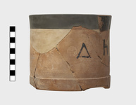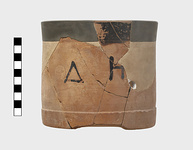 | Description: | Mended from many pieces; most of the lower part preserved, but of the rim only two small fragments. As P 3559 (Β 590) from the same well. The lower 0.024m. of the wall projects slightly. Here also the double-bodied owl stamp, upside down, appears between the letters Ν and Δ; the fragment between Μ and Ο is missing. Fabric and finish as P 3559. The glaze a rather dull black. ADDENDA Restored in plaster, complete with cross bars copied from P 6209 (Β 1602), but without central stem. | |
