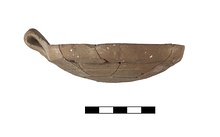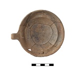 Round bottom, vertical rim with prominent interior flange. Loop handle. Traces of purple pigment in interior.