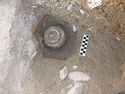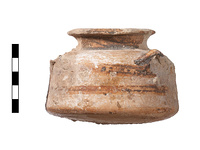 | Description: | One complete handle, other two missing, body intact, rim chipped. Glaze cracked where thick. Rounded bottom. Straight, slightly inclined wall, curved shoulder, flaring rim. Horizontal handle(s) on shoulder, round in section. Matte glaze decoration fired dark orange to brown: three concentric circles on underside, three stripes on body, one on shoulder, one on each handle. Neck, including rim, painted solid on interior and exterior. Pale orange clay. | |