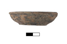 | Description: | Nearly complete small pyre saucer, missing small portion of rim and body. Base slightly raised. Slightly concave wall near base, walls uneven. Thin peeling gloss all over, thicker and better preserved on underside. Underside with string marks. Black gloss exterior, red interior. Cf. Agora XII, no. 1575 (P 19302), 1st quarter of 4th c. B.C. | |
