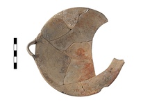 | Description: | Nine joining fragments; one handle and ca one quarter of wall and rim missing. Burnt. Well tooled disc foot. Ribbon handles. Decoration in gloss bands on floor-one band at rim, dot at center, but rest of banding pattern unclear. Red to brown gloss. Orange to brown clay. | |