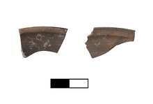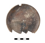 | Description: | Ten joining fragments. Two tiny non-joining fragments may belong (b,c). Very shallow saucer with flat, string-cut base and straight wall. Inner edge of rim has sharp edge. Orange to brown clay; dull to metallic gloss, mottled black to purple. | |