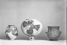 | Description: | Mended from many pieces; complete save for one handle and chips. Heavy flaring ring foot; at the line of the handle attachments, a little above the middle of the body, a raised band. The rim flat-topped, with a groove around its outer edge. Around the body, two bands of glaze above and two below the raised band; on it, diagonal strokes. The inside probably glazed all over. Soft pinkish-buff clay; glaze fired red to black; much peeled. | |