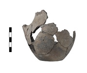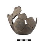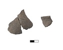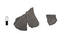 | Description: | Partially preserved cooking pot mended from numerous fragments (a), two joining body fragments (b) and one loose rim fragment (c). Handle and most of upper body missing. Miniature size cooking pot with secondary burning. Flat base, globular body, flaring rim. Distinct horizontal burnishing marks on exterior. Coarse gray fabric with white grit and a little silver mica. Middle Geometric I. | |
