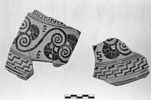 | Description: | Two fragments, mended from seven pieces, from a large lid; unglazed inside. Pinkish-buff clay with a few red bits. Glaze fired red to black. Incision for a small circle at the junction of the scrolls and for the petals of the palmettes that spring from between them. Traces of added red on these, center, and on alternate petals. Protoattic. | |