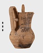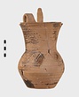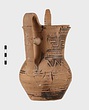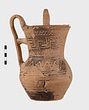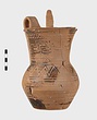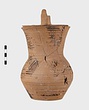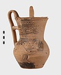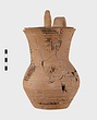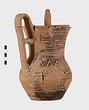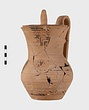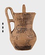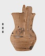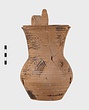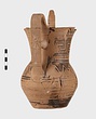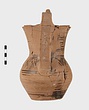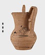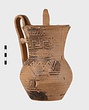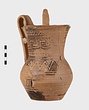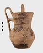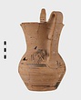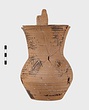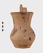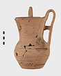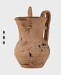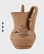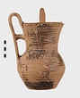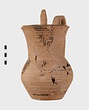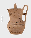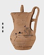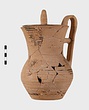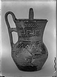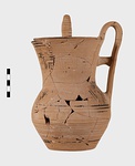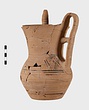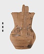 | Description: | Flat bottom; rising handle from rim to point of greatest circumference; a strut from its middle to the neck. Solid black glaze only around the bottom; the rest of the vase decorated with narrow black bands and with a zone of chevrons on the body, and on the neck a maeander between two zones of connected lozenges. Short strokes on the top of the lip; on the handle, black glaze on one side; on the other, none; the inside also unglazed. Pinkish buff clay, much peeled. | |