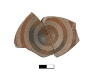 | Description: | Two joining fragments of foot and lower wall. Rim and handles missing. Low ring foot; convex underside with groove at edge. Unglazed outside. On inside, large gloss circle at center of floor, surrounded by three gloss bands. Pinkish buff clay, burned gray at center of floor. Red to brown gloss. [Fragments of more pyre vessels in lot: rim of ribbon-handled plate, rim of pyre lekanis, saucer, and plate with concave rim.] | |