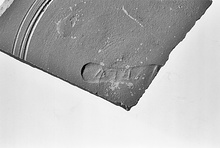 | Description: | Fragment from the center of a Western Sigillata plate. Within three circular grooves, a large foot-shaped stamp with the letters: E L V Deep pink clay; the underside unglazed; covered with a buff slip. The top glazed with a lustrous but rather coarse red. Local imitation of one of the finer Roman wares? | |