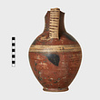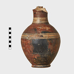 | Description: | Rim missing and top of handle. The body and neck are covered with black glaze, except for reserved bands, the central one decorated with a zigzag in dilute glaze. Bars on the handle. Early Geometric. | |