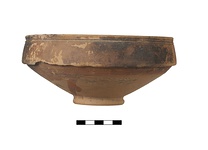 | Description: | Complete. Glaze worn and largely peeling. Some sign of burning. Deep bowl on a narrow ring foot. Oblique wall and high vertical rim. Rim is slightly hanging with deep groove underneath. Two grooves below lip. Glazed inside and rim with splashes on lower wall. Yellow-buff fabric. Red to dark brown glaze. 3rd-4th c. A.D. Agora V, K 42-44 (P 3093, P 8498, P 8504). | |