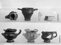 | Description: | One handle and much of wall missing. Similar in shape to P 3708, but the handles moulded, vertical, spurred. On the floor are four double ovules stamped within a spiral on outside of base ring, and one on its bottom. Rich black glaze. ADDENDA P 3708: Moulded base ring; shallow lower bowl; high side wall; hollow rim; loop handles, horizontal. | |
