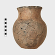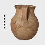 | Description: | A crude jug with wide mouth and full body and broad ribbon handle. Flat bottom. Coarse red clay with a polished and pared light brown surface. Handmade. | |