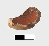 | Description: | Single fragment preserving less than a quarter of the foot. Flaring ring foot rounded on underside. Interior misfired orange with mottled black. Reserved: exterior face of the foot and underside of the floor but for with thin red circle. Underside of the foot matt black glaze. Added purple zone at base of the wall. Fine pinkish Attic clay. | |